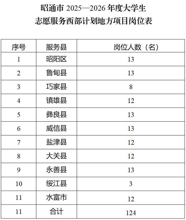 根据团省委、省教育厅、省财政厅、省人力资源和社会保障厅等部门关于实施2025年西部计划的工作部署,现将昭通市2025—2026年度大学生志愿服务西部计划省级地方项目志愿者招募有关事项公告如下: