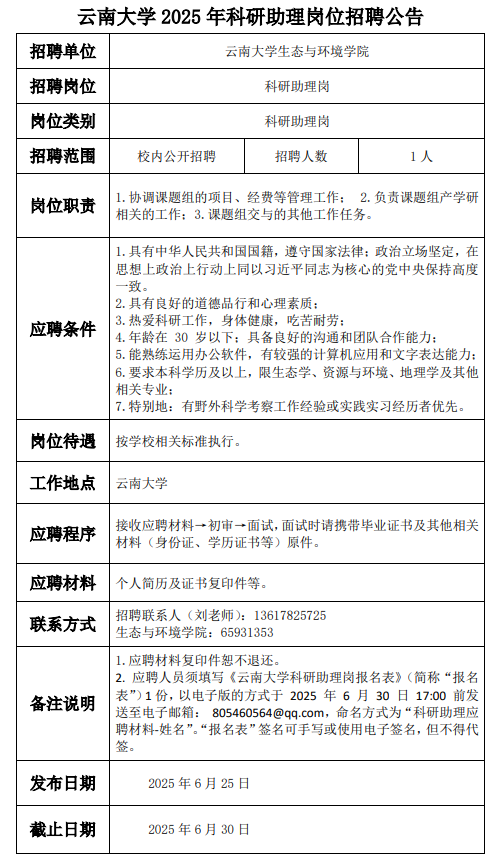 已结束 【合同制】云南大学生态与环境学院2025年科研助理岗位招聘公告(招若干人,06月25日~07月10日报名)