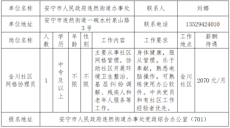 根据《云南省人力资源和社会保障厅 云南省财政厅关于印发云南省城镇公益性岗位管理暂行规定的通知》(云人社通〔2024〕25号)文件要求,按照公开、公平、公正的原则,面向社会公开招聘公益岗位人员1名,现将有关事项公告如下: