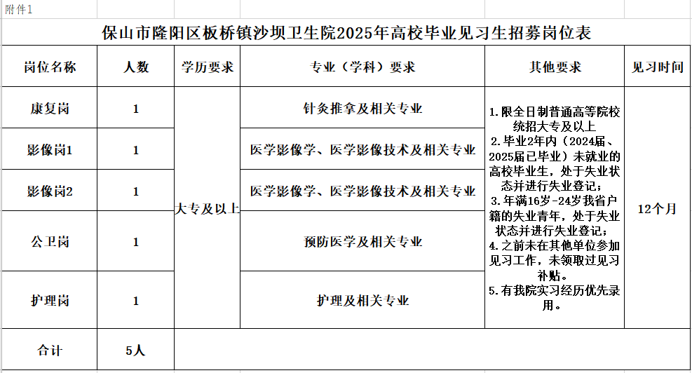 附件1:保山市隆阳区板桥镇沙坝卫生院2025年招聘见习人员岗位设置表.xlsx