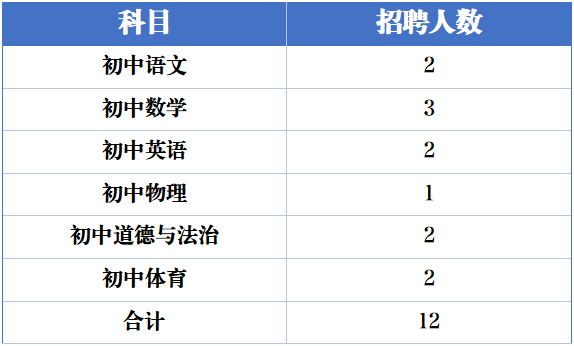 1.本次共招聘初中学段12人,具体科目及人数如下: