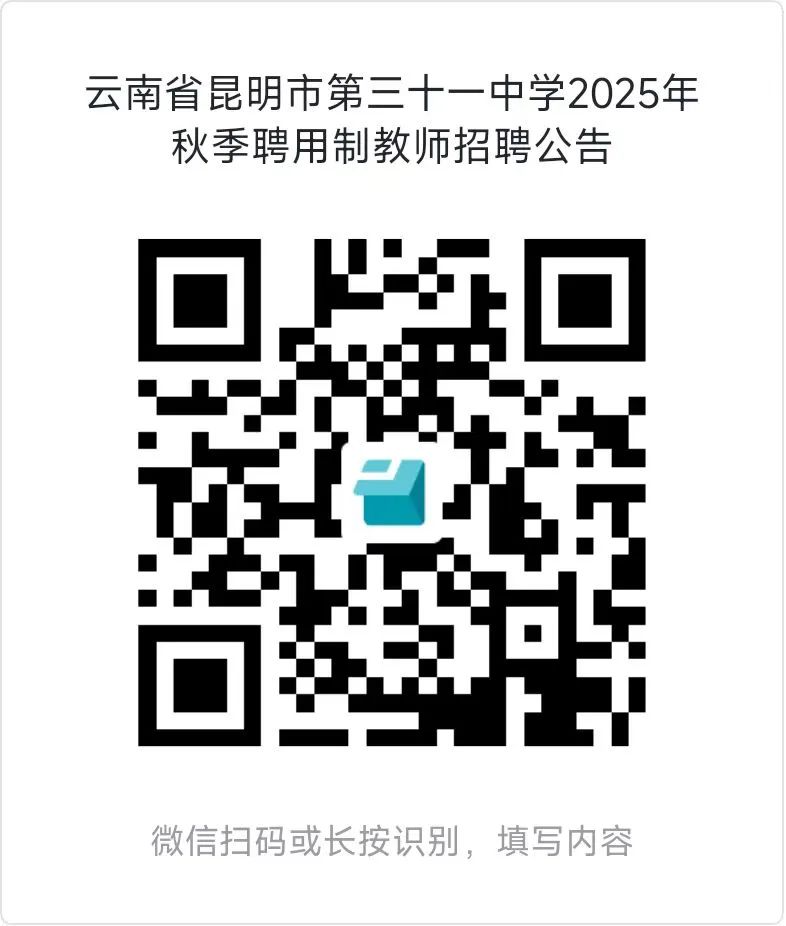 本次招聘工作由云南省昆明市第三十一中学统一组织,程序包括网络报名、资格审查、笔试(90分钟)、面试(15分钟无生模拟课堂+ 5分钟专业提问)、政审、体检、公示、录用。(注:笔试及面试具体时间、地点及相关事宜另行通知,务必保证网络报名时预留的电话畅通。)