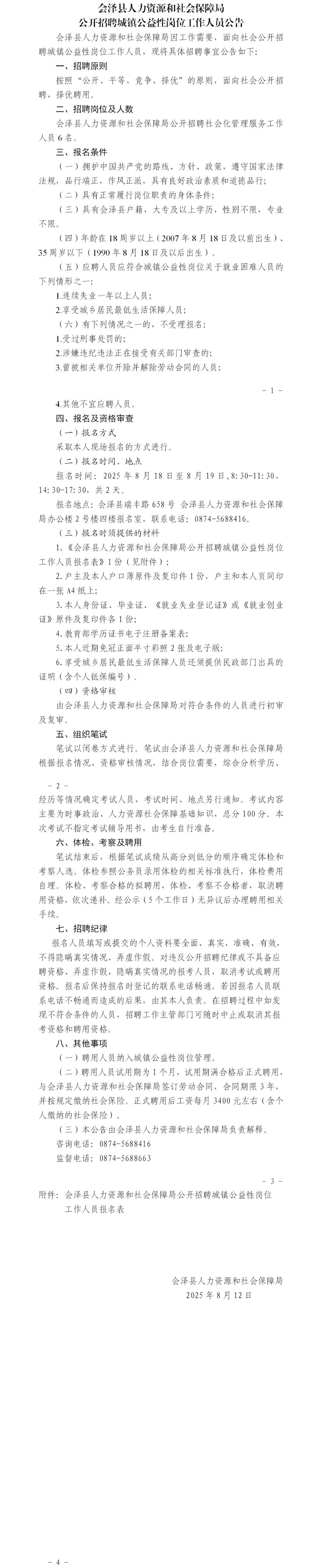 标签: 会泽县人力资源和社会保障局 公开招聘 城镇公益性岗位 人力资源招聘 公益性岗位公告