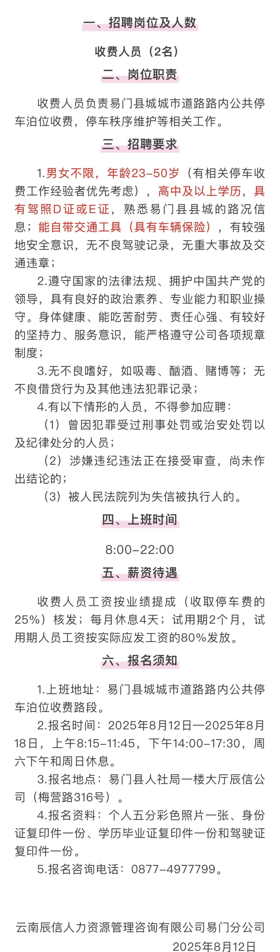 已结束 【合同制】易门兴牧产业发展有限责任公司招聘停车收费人员公告(招若干人,08月13日~08月28日报名)