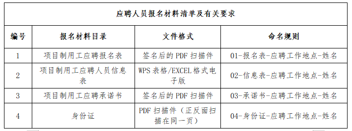 应聘人员按照应聘人员报名材料清单及有关要求提供报名材料,将《项目制用工应聘报名表》(附件1)、《项目制用工应聘人员信息表》(附件2)、《项目制用工应聘人员承诺书》(附件3)及相关报名材料以压缩包形式(邮件主题、压缩包均统一命名为“应聘工作地点-姓名,例如:普洱市澜沧县-XXX”)发送至电子邮箱:pegdjzp@163.com。本次招聘仅接受电子邮件方式报名,应聘材料一经提交,不能修改,请务必慎重填报。