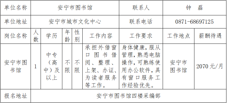 根据《云南省人力资源和社会保障厅 云南省财政厅关于印发云南省城镇公益性岗位管理暂行规定的通知》(云人社通〔2024〕25号)要求,按照公开、公平、公正的原则,面向社会公开招聘公益岗位人员1名,现将有关事项公告如下: