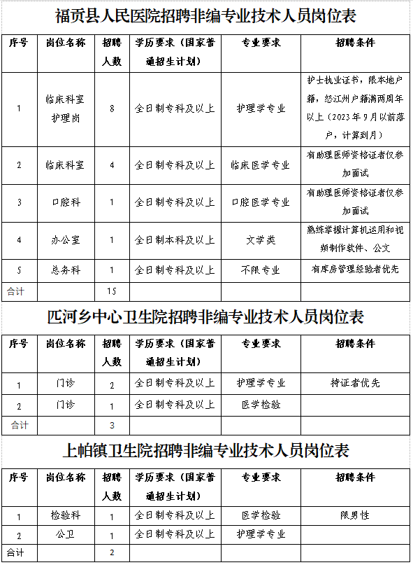 福贡县人民医院拟招聘专业技术人员15名;上帕镇卫生院拟招聘2名,匹河乡中心卫生院拟招聘专业技术人员3名(住宿安排)。