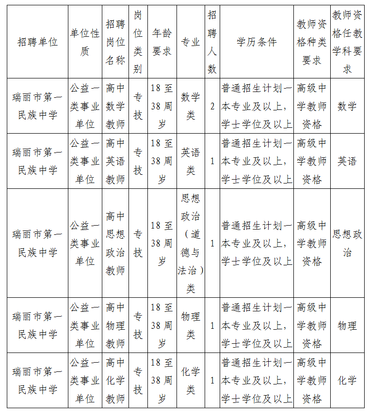 本次共招聘教师6名,具体招聘岗位及招聘条件,详见《云南师范大学附属瑞丽国门高级中学(瑞丽市第一民族中学)2026年招聘人员计划表》。报名人员年龄在18周岁以上,38周岁以下。