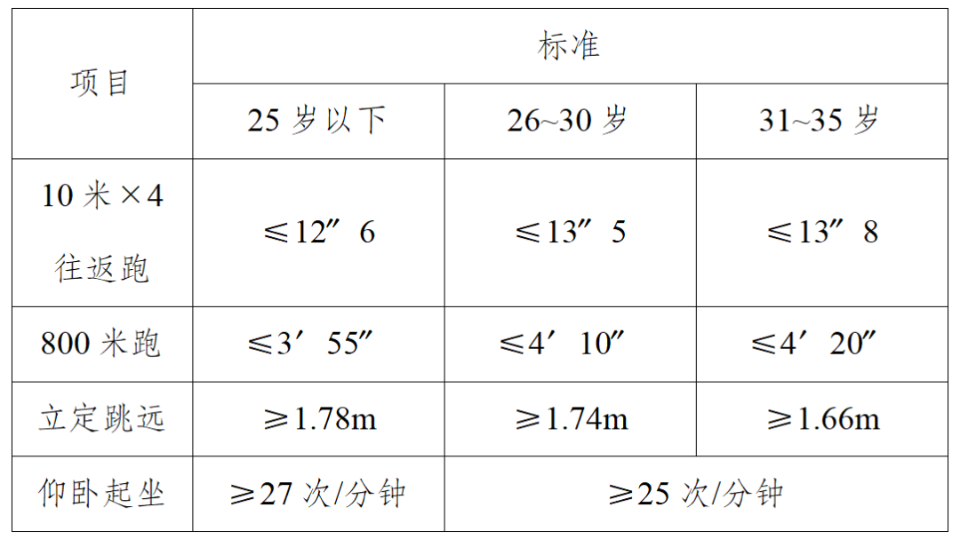 体能测试由10米×4往返跑、800米跑、立定跳远、仰卧起坐四个项目组成,占综合成绩的70%。其标准按照人民法院司法警察基本体能评分标准执行。体能测试标准为: