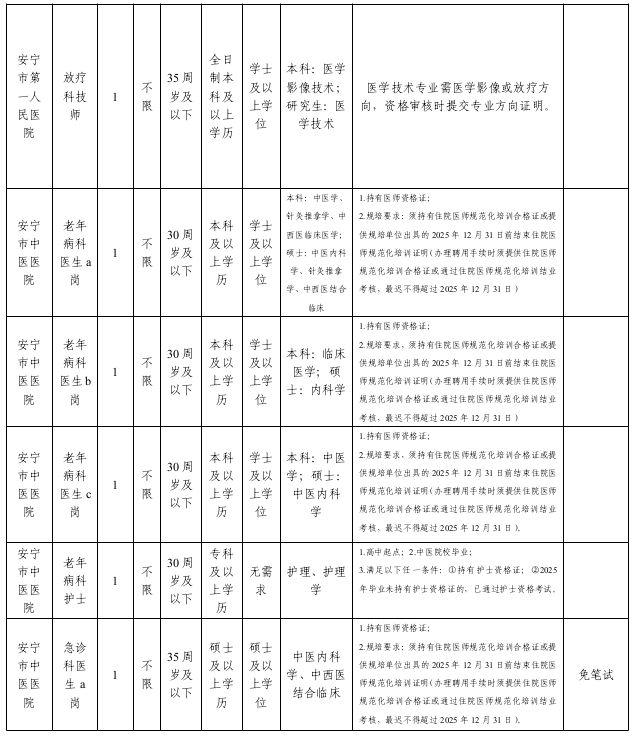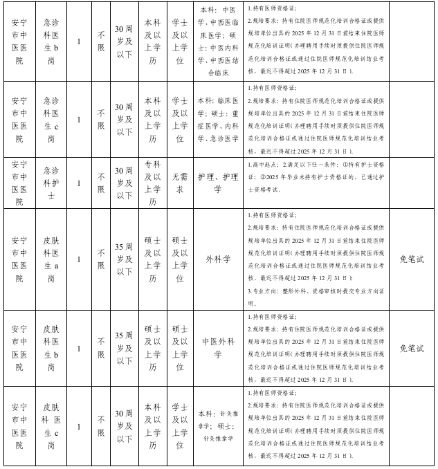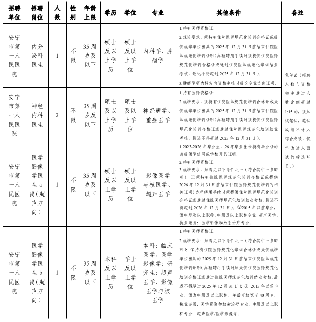 1.应聘安宁市第一人民医院、安宁市中医医院岗位,参照事业单位工资福利待遇执行。入职后符合事业单位岗位招聘要求的,可参加招聘单位事业单位公开招考。