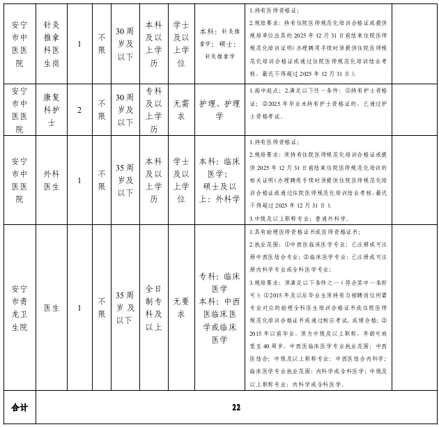 安宁市卫生健康局下属医疗单位安宁市第一人民医院、安宁市中医医院、安宁市青龙卫生院3家医疗单位因工作需要,本着公开、公正、择优原则,面向社会招聘22名编外聘用人员,本次为非事业编制招聘,招聘事项公告如下: