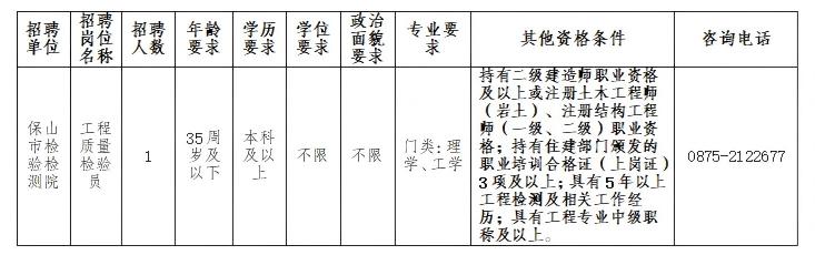 2.报名方式:此次招聘采取网络报名方式,应聘人员填写《保山市检验检测院编外聘用人员报名登记表》(附件),连同本人身份证、毕业证、学位证等相关材料,扫描(格式为JPG或PDF,图像清晰)打包压缩上传至报名工作邮箱:bszjzxrsb@163.com进行报名。邮件标题及附件压缩包文件名称格式为:招聘岗位+姓名+联系电话(如:工程质量检验员杨××13*********)。