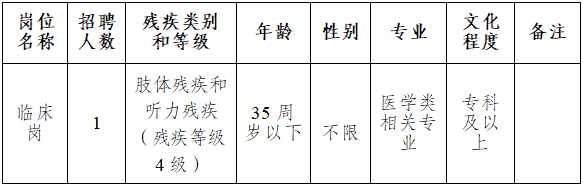 为贯彻落实国家关于促进残疾人就业的相关政策,医院结合实际用人需求,现面向社会公开招聘编外医务人员(残疾人)1名,现将具体招聘事项公告如下: