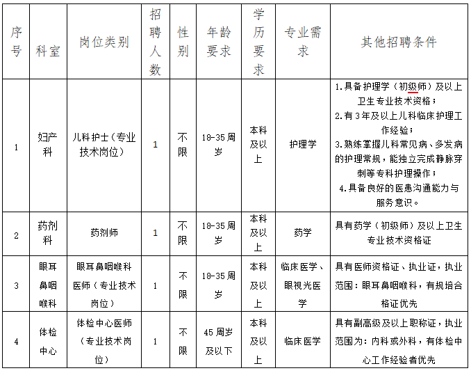妇产科儿科护士1名、药剂科药剂师1名、眼耳鼻咽喉科眼耳鼻咽喉科医师1名、体检中心体检中心医师1名,共计4人。(性别不限)