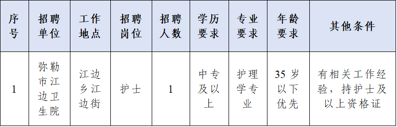 为进一步充实弥勒市紧密型县域医共体人才队伍建设,提升综合服务能力,满足弥勒市紧密型县域医共体发展及人民群众对医疗服务的需求,诚邀有志之士加入,共同奋斗、共绘蓝图,弥勒市紧密型县域医共体江边分院(江边卫生院)公开招聘合同制护士1名。