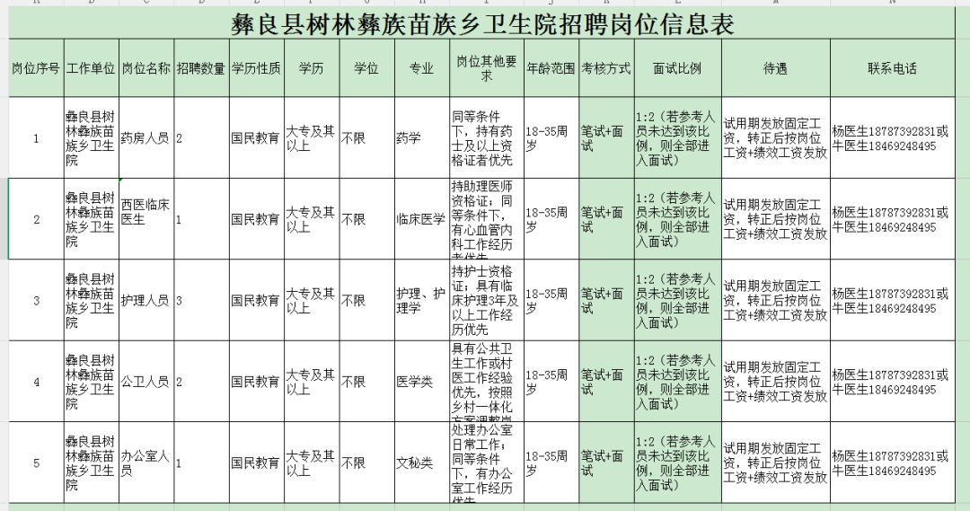 护理人员3名,西医临床人员1名,办公室人员1名,药学人员2名,公卫人员2名。具体岗位要求见彝良县树林彝族苗族乡卫生院招聘岗位信息表。