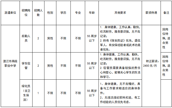 澄江市职业高级中学因工作需要,委托澄江市启澄人力资源有限责任公司,面向社会公开招聘学生宿管岗位2人、学校后勤人员2人、绿化员(含卫生保洁)1人,现将有关事项公告如下: