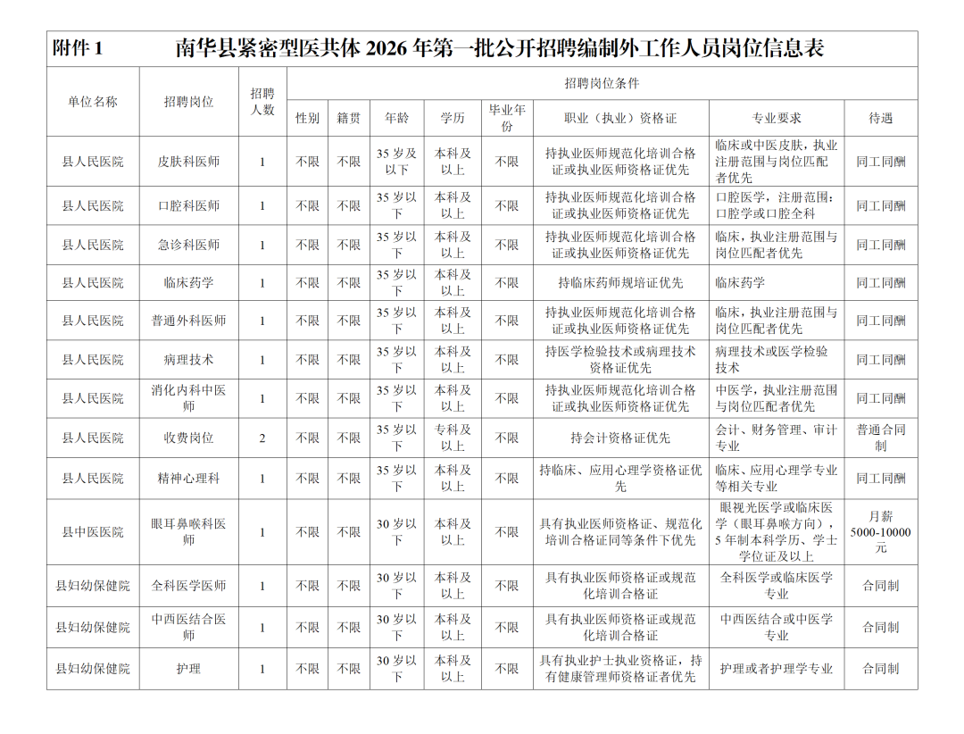 详见《南华县紧密型医共体2026年第一批公开招聘编制外工作人员岗位信息表》(附件1)。