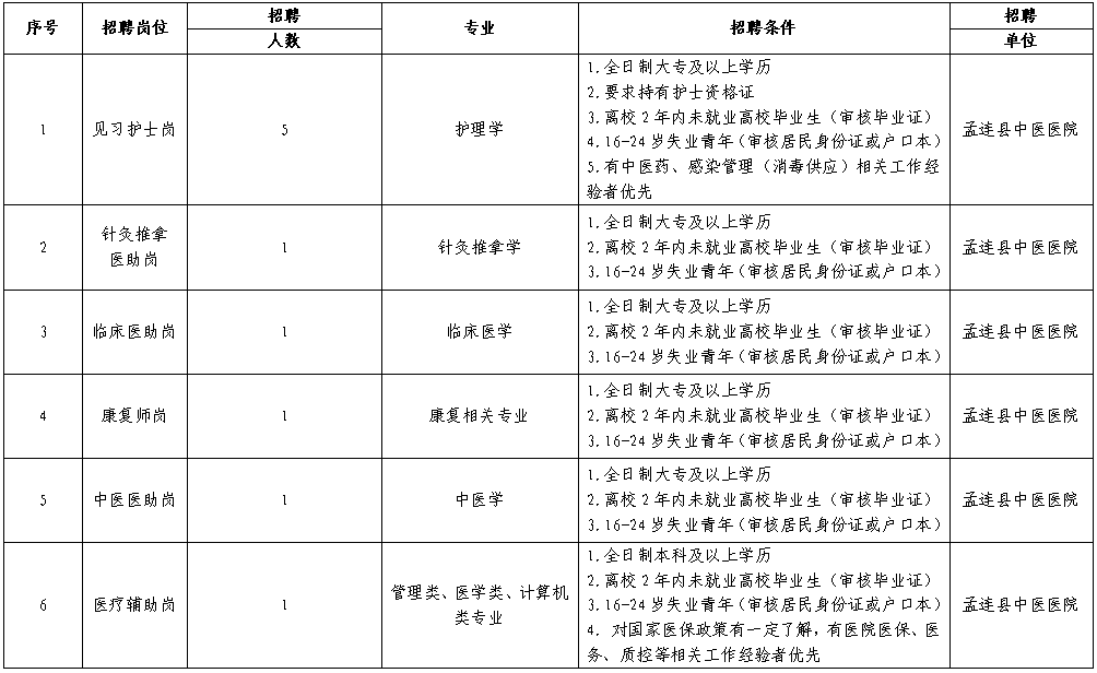 根据《人力资源社保障部教育部科技部工业和信息化部等10部门关于进一步推进实施百万就业见习岗位募集计划的通知》(人社部发〔2023〕27号)文件精神,为加强部门间的协调联动,进一步密切沟通交流,落实部门主体责任,发挥职能优势,着力加大就业见习基地认定和就业见习岗位开发,合力推进就业见习深入开展。孟连县中医医院招聘见习岗10名,现将有关招聘事宜公告如下: