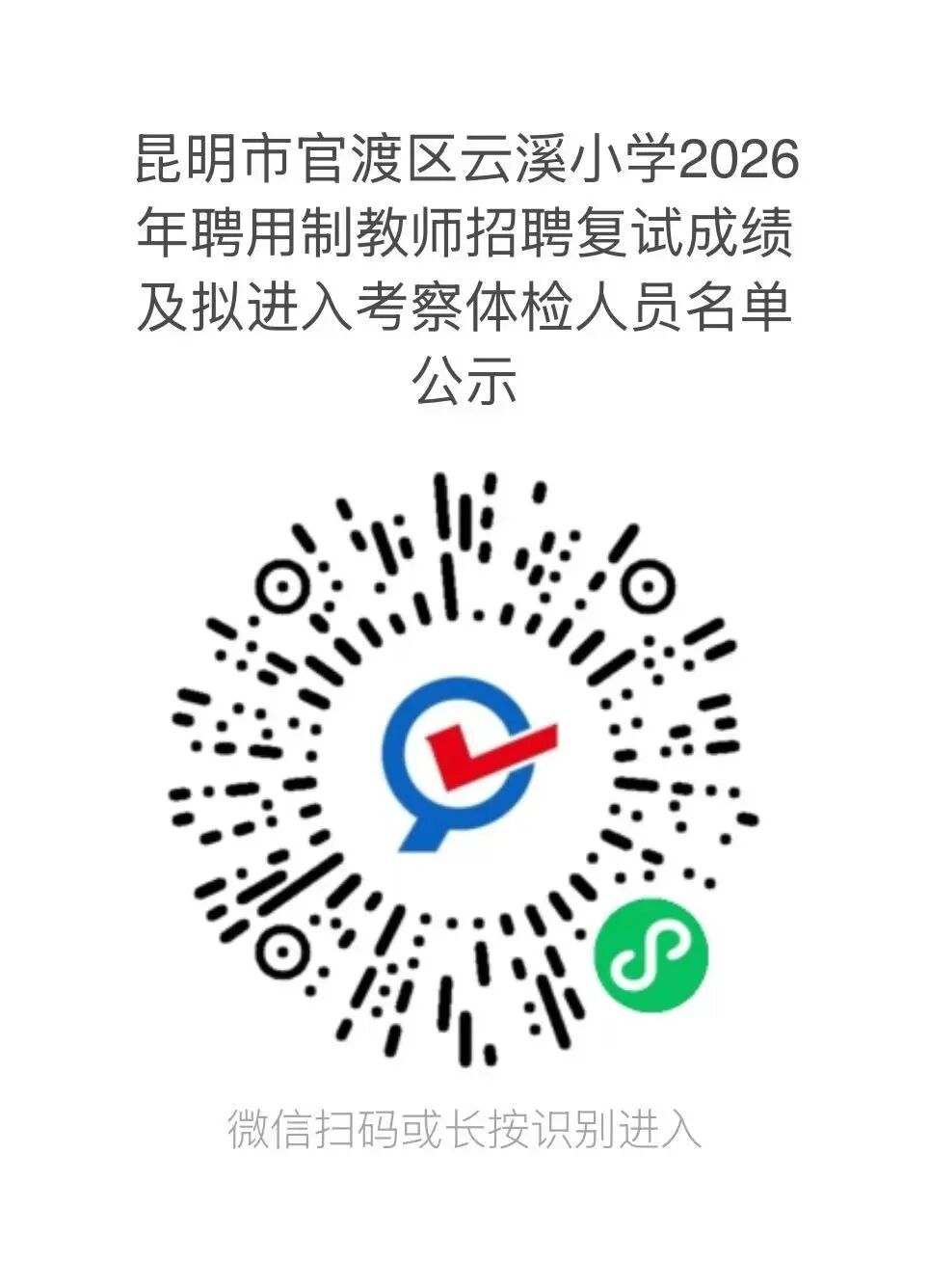 确定拟进入考察、体检人员:根据复试成绩高低排序,按照招聘岗位数与拟进入考察体检人员数1:1比例确定进入考察体检人员。4月1日15:00-19:00,进入复试人员可通过微信扫码或长按以下二维码,输入姓名和身份证号查看拟进入考察体检人员公示。