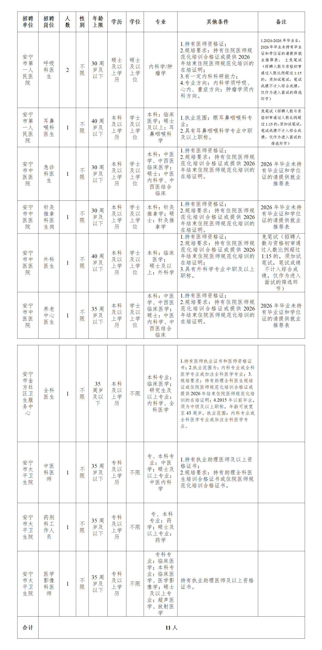 安宁市卫生健康局下属医疗单位安宁市第一人民医院、安宁市中医医院、安宁市金方社区卫生服务中心、安宁市太平卫生院4家医疗单位因工作需要,本着公开、公正、择优原则,面向社会招聘11名编外聘用人员,本次为非事业编制招聘,招聘事项公告如下: