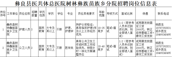 护理人员3名,公卫人员2名。具体岗位要求见彝良县医共体总医院树林彝族苗族乡分院招聘岗位信息表。