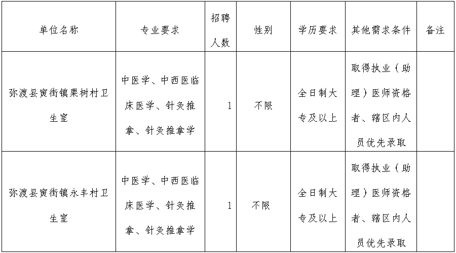 为满足村卫生室业务工作的需要,弥渡县寅街镇中心卫生院现面向社会公开招聘乡村医生2名,现将有关事项通告如下: